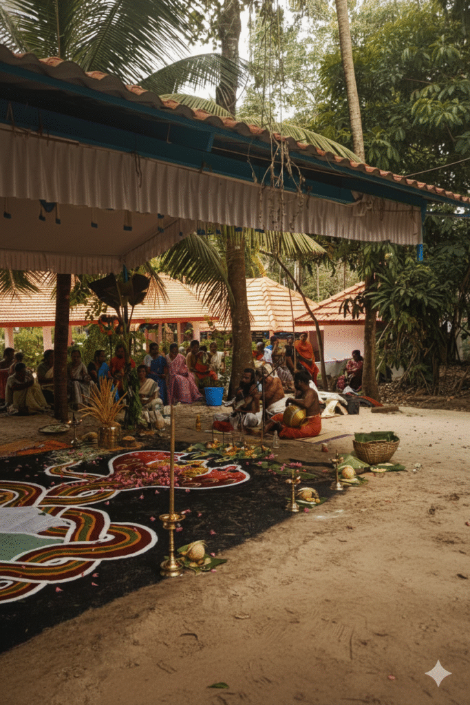 The main festival of the temple is the Ayilyam Mahotsavam, celebrated annually on the day of the Ayilyam star. This sacred occasion is observed with great devotion by both the family members and the local community. During the festival, special rituals such as Deepaaradhana (lamp worship), Pushparchana (flower offerings), Bhajans, and Annadanam (food offerings) are performed with deep reverence. The celebrations also include Chendamelam (traditional percussion), Velichappadu (oracle rituals), and various cultural performances, adding to the festive spirit. The Ayilyam Mahotsavam stands as a beautiful symbol of faith, unity, and togetherness, strengthening family bonds and community harmony.